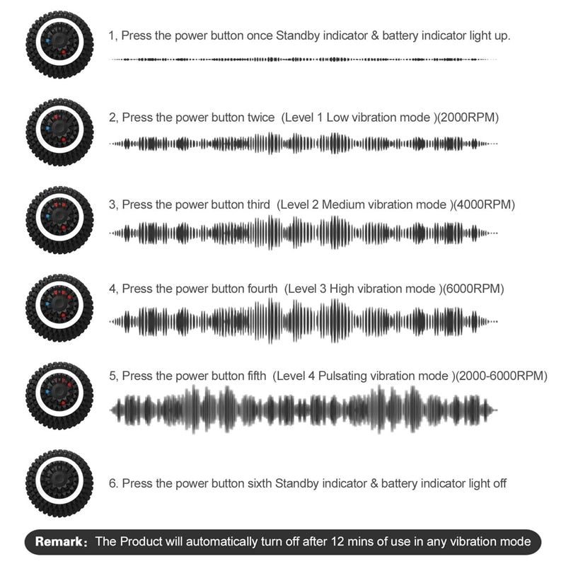 4 Level Vibration Mode-Enhance your Pre-workout and Recovery system with Foam roller Low/Medium/High/Pulsating Vibration Modes at your choice.perfect for warming up,circulation improvement and recovery of sore and tight muscles Rechargeable&Ultra-Portable-With only 3.9inch diameter and 0.79lbs,light-weight and compact therapy ball is so portable that you can bring to anywhere you like for relaxation,best comp for your camping trip,training,yoga or fitness Washable-All Surrounded by silicone,the waterproof grade is IP65,you can wash the massage ball directly,but don't left in water for a long time Pain Reduction-Massage ball gives you access to hard to reach pain points and provides relief,Trigger Point Therapy and relaxation,It works to massage and relieve your back,hips,legs,arms,waist,and feet Charging time:about 4 hours Motor operating temperature:65 ° C Colour:Black Material:ABS+silicone Package Contents: 1* Electric Massage Ball 1* USB line 1* Instruction manual Only the above package content, other products are not included. Note: Light shooting and different displays may cause the color of the item in the picture a little different from the real thing. The measurement allowed error is +/- 1-3cm.   Electric Massage Ball